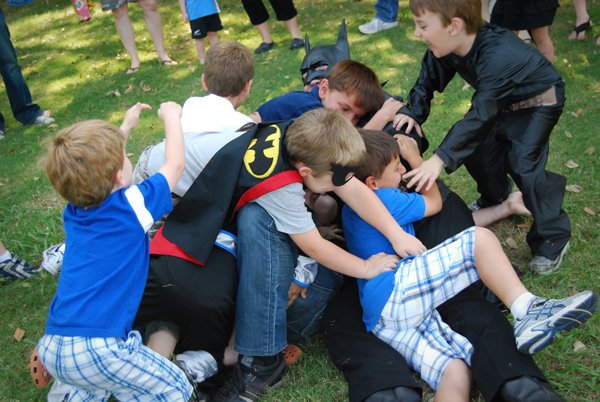 With my superhero dominance restored, it’s time to start thinking of an exit strategy, as the time allotted for me at the party is drawing to a close. After the birthday song is sung, the announcement is made that the Bat Signal has been spotted and that I have to go fight some crime. The kids all say that they don’t want me to go. Hey, maybe I don’t suck so bad after all. I tell them that I wish I could stay, but that I’m needed elsewhere. As a consolation, I start dispensing out Bat Hugs, which much like the Bat-Five, is a regular hug, only one person is dressed like Batman. After telling Ayden happy birthday one more time, I kneel down and call all the kids in for one more group hug as a grande finale…..and am subsequently gang tackled by every last kid at the party. I can feel the love. The love is heavy. I think one kid even got airborn.